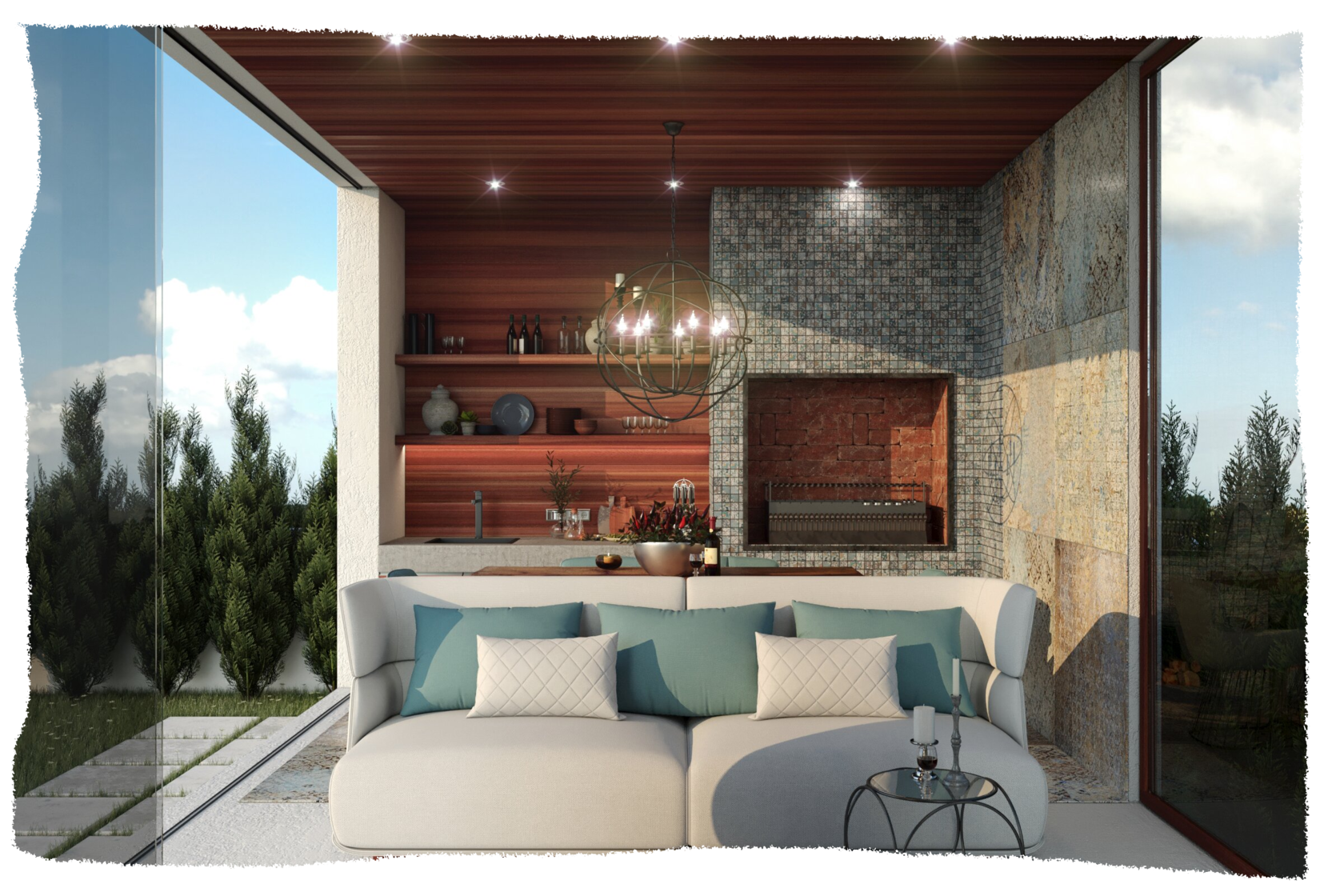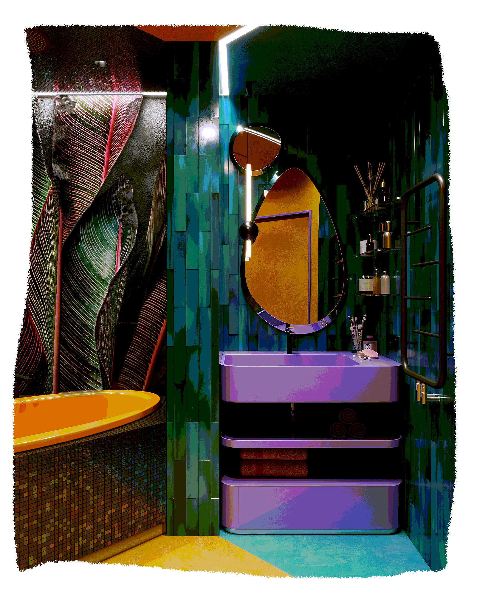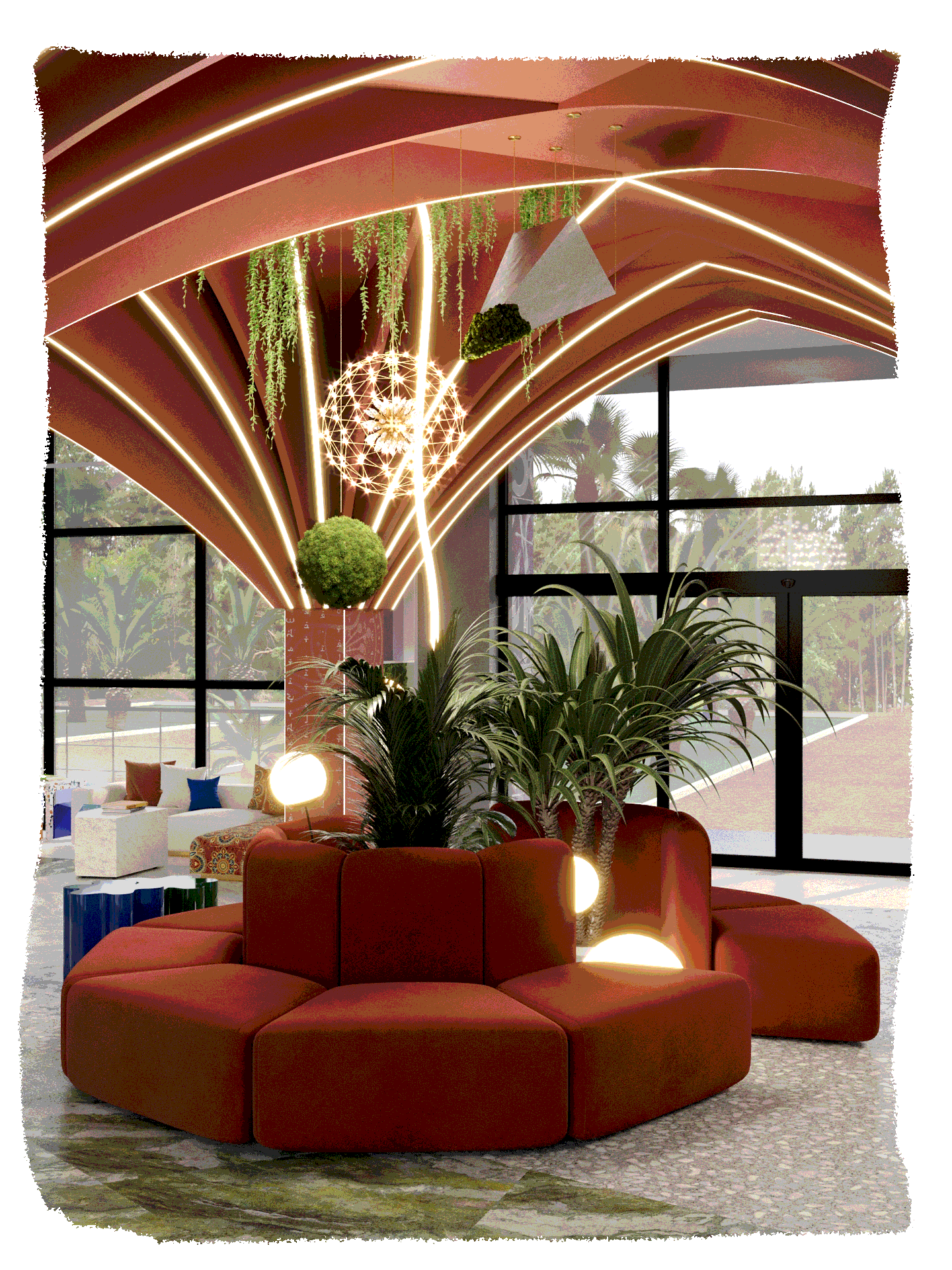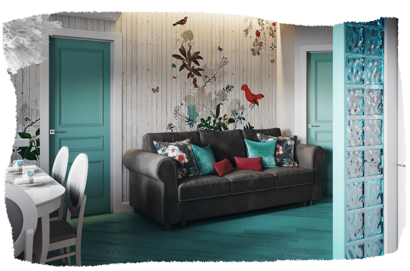 Естественная яркость, взятая у мира экзотических растений, бирюзовый пол, олицетворяющий море, и обилие света с южным воздухом–всё это показывает основную идею проекта.