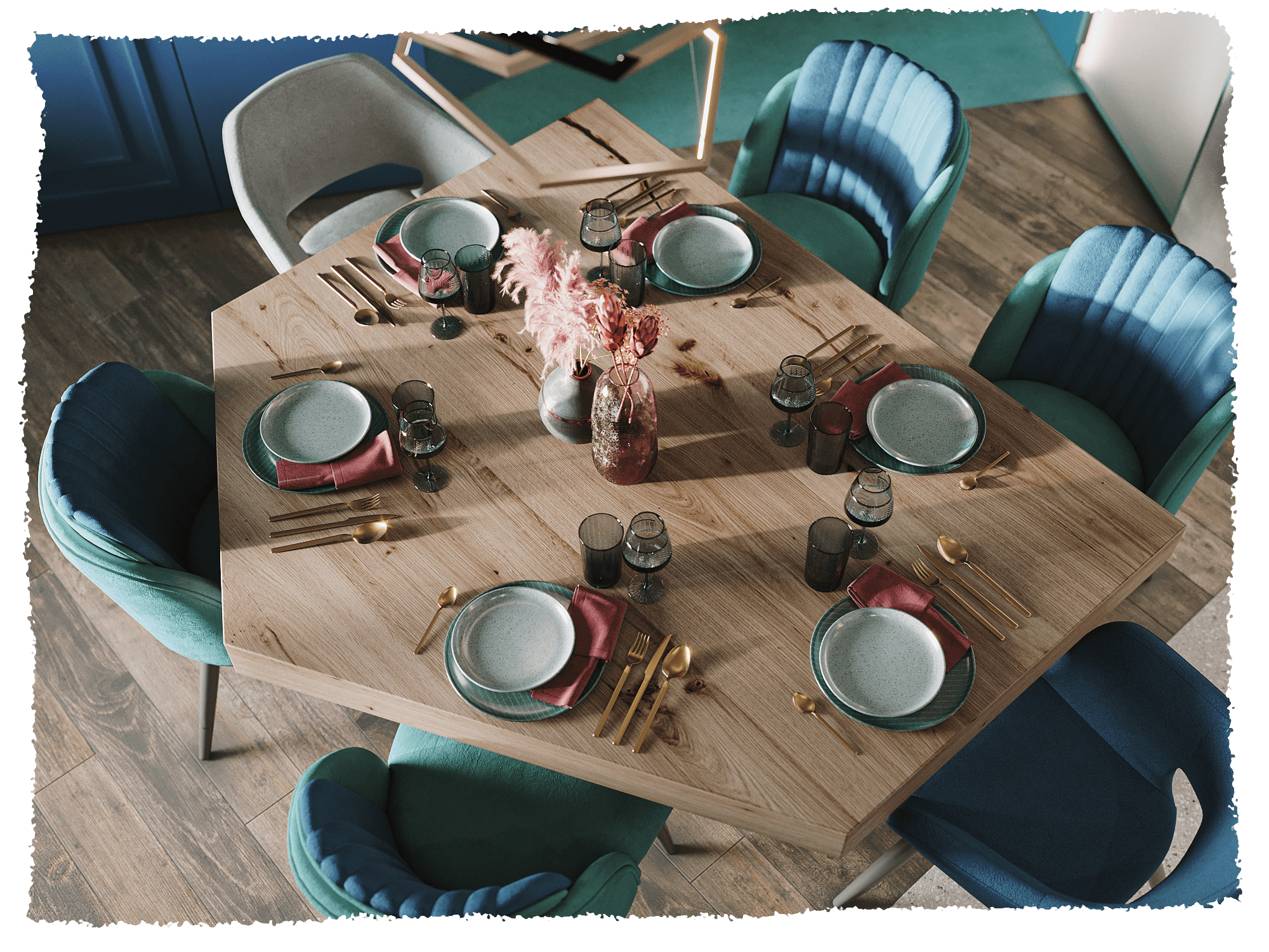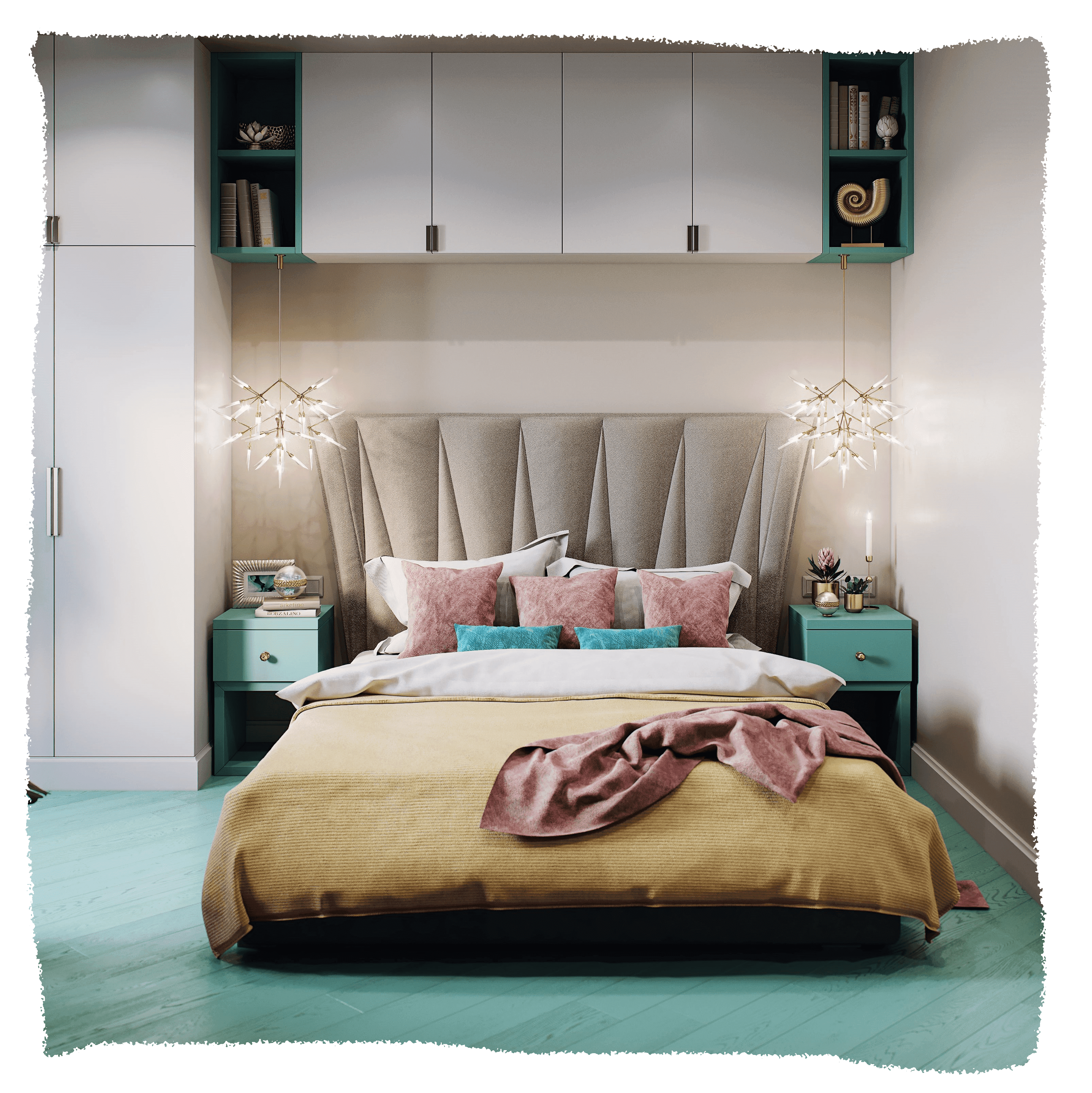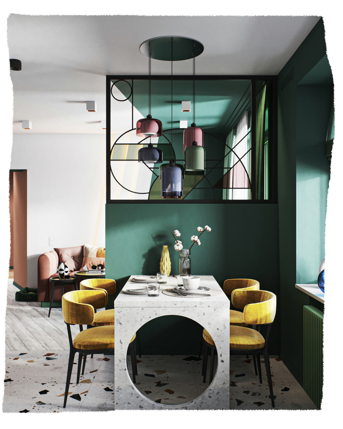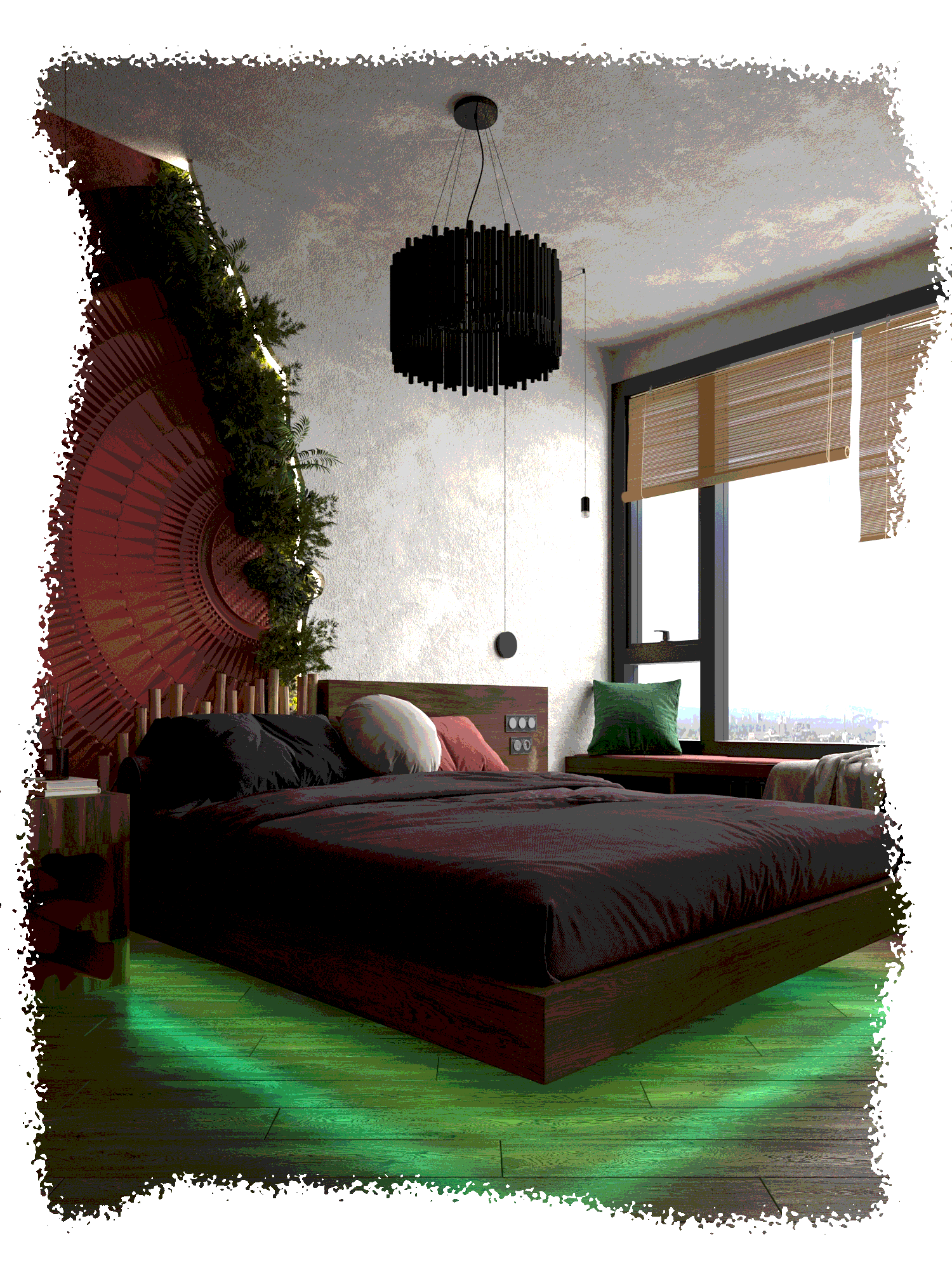 Естественная яркость, взятая у мира экзотических растений, бирюзовый пол, олицетворяющий море, и обилие света с южным воздухом–всё это показывает основную идею проекта.