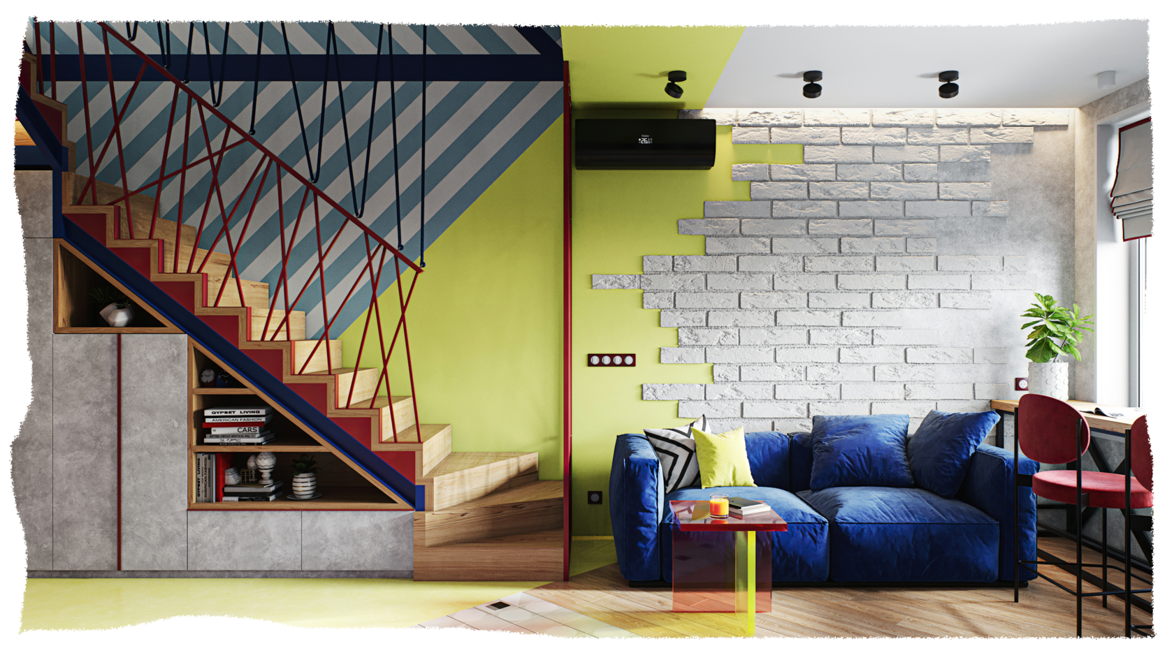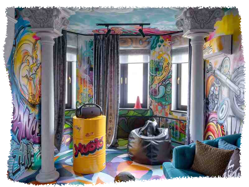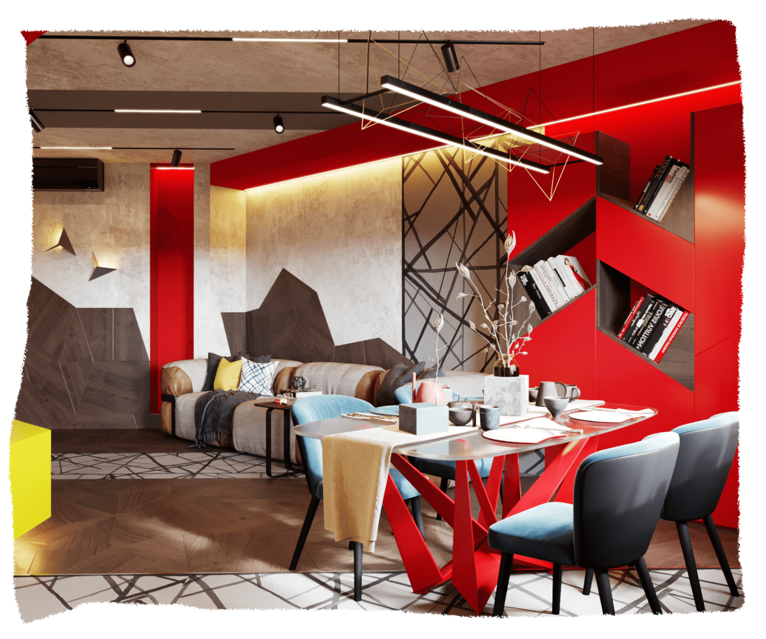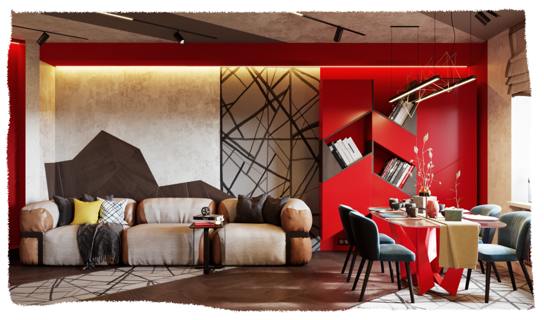 Реализованный дизайн-проект гостиной в рамках ТВ-проекта «Квартирный вопрос» был создан для дерзкой, резкой и стремительной молодой пары. …страстная кизомба, бачата, хастл, сноуборд и байк.