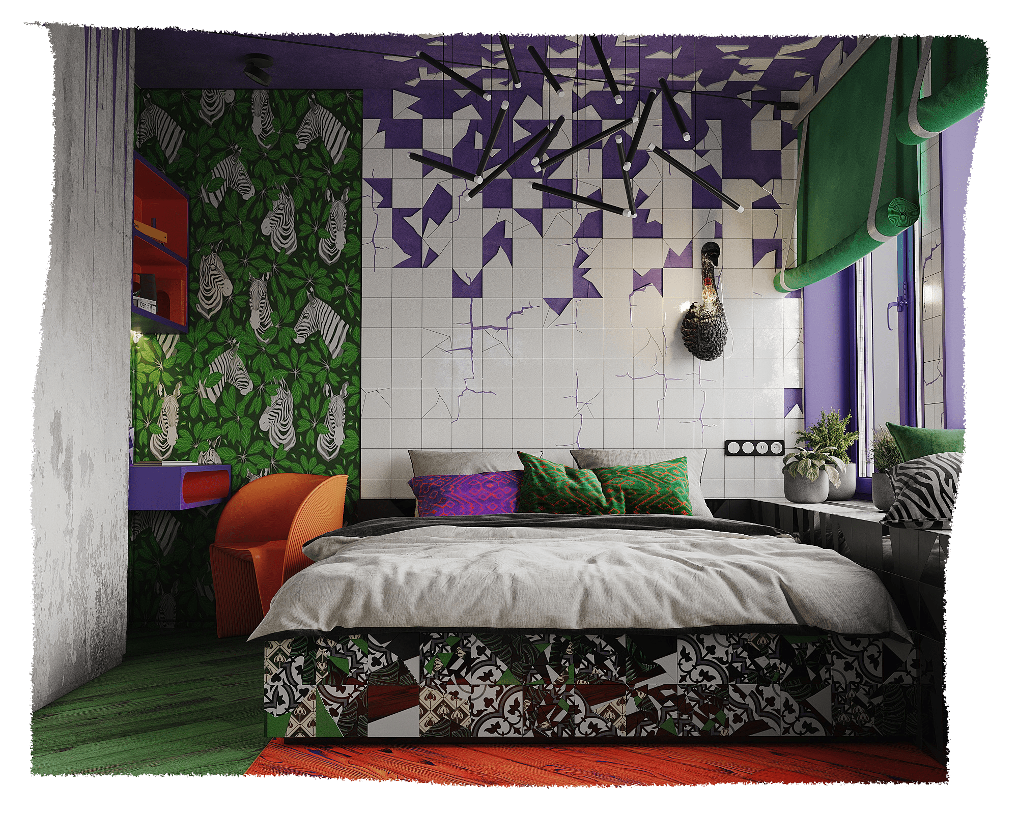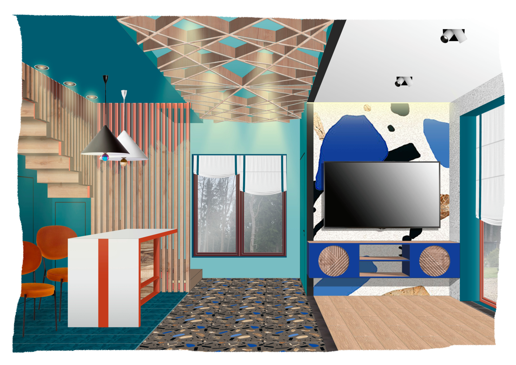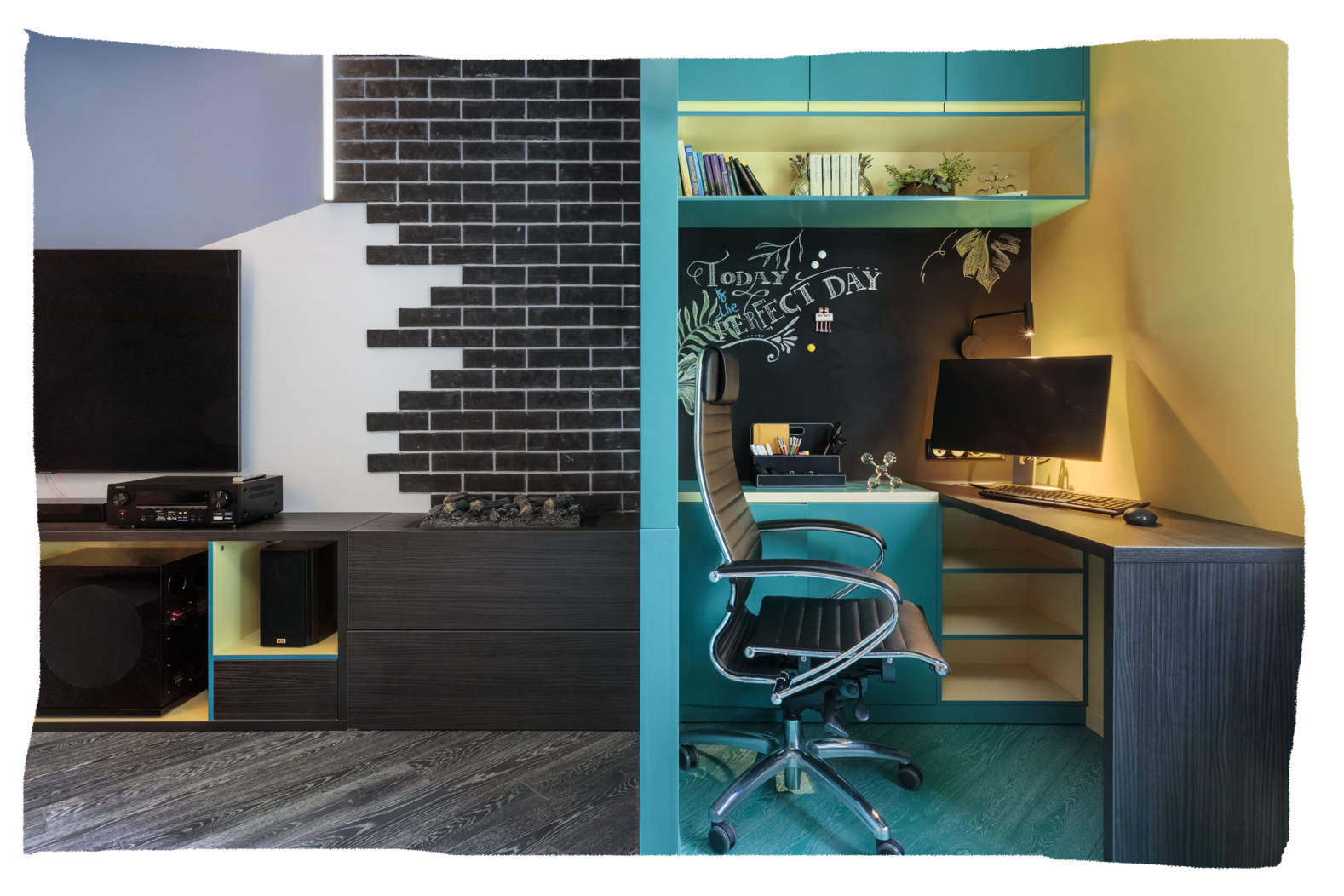 Реализованный дизайн-проект гостиной в рамках ТВ-проекта «Квартирный вопрос» был создан для дерзкой, резкой и стремительной молодой пары. …страстная кизомба, бачата, хастл, сноуборд и байк.