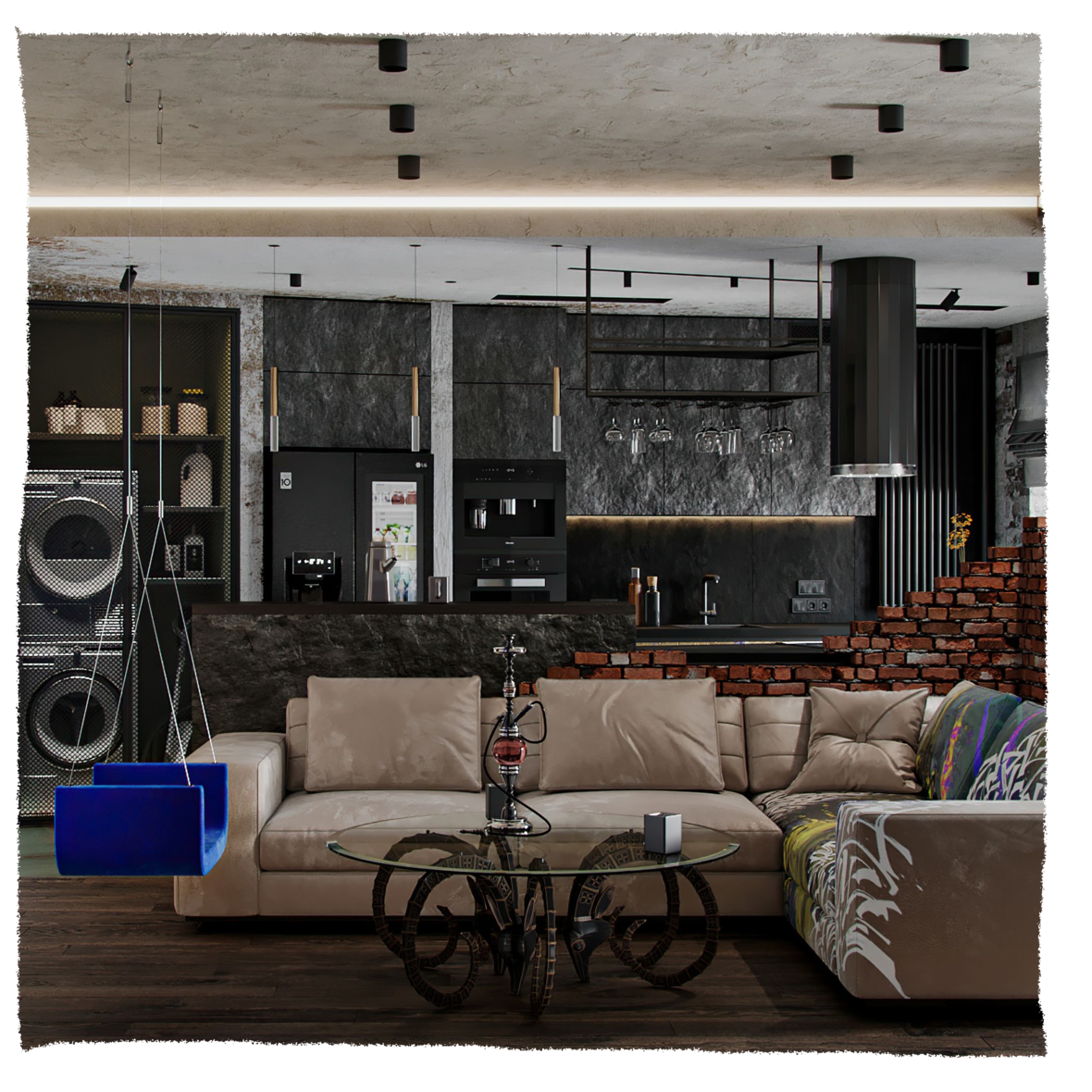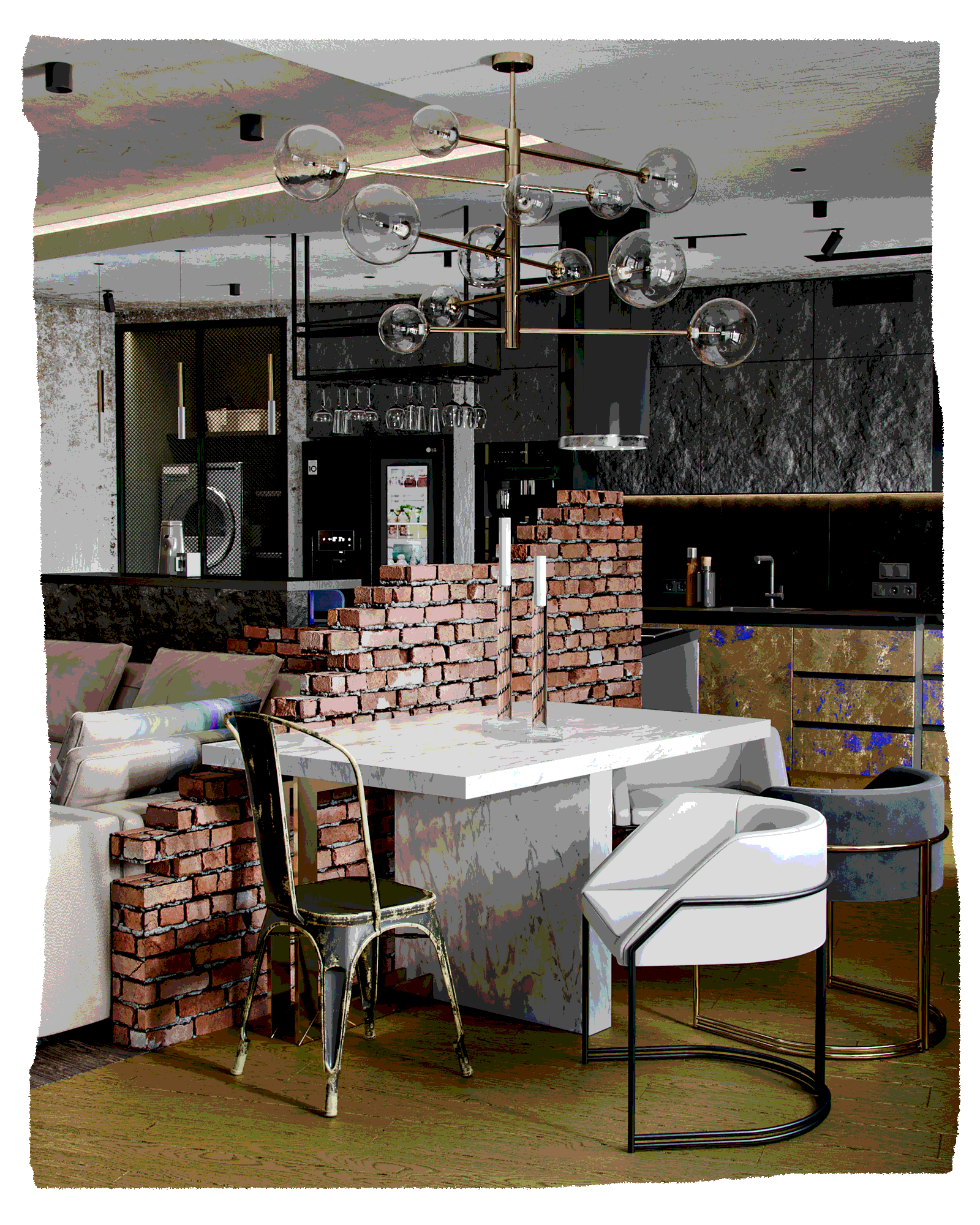 Заказчик – молодой успешный IT-специалист, разбирающийся в моде и стиле. Это нам и нужно было показать в проекте, чтобы отразить его личность в интерьере. Так, мы разработали для него современное пространство с абсолютно персонифицированным стилем, объединившим элементы лофта в виде брутальных фактур с изящным гламуром.