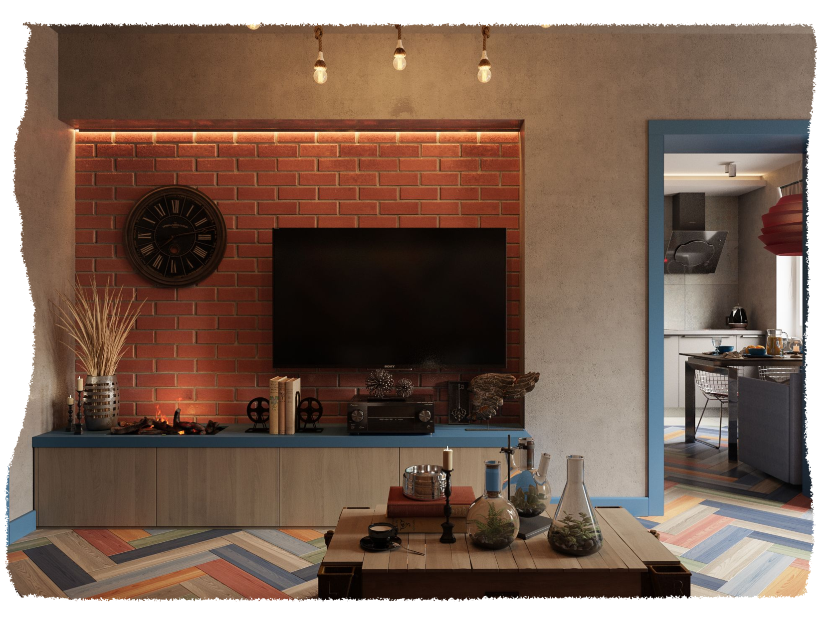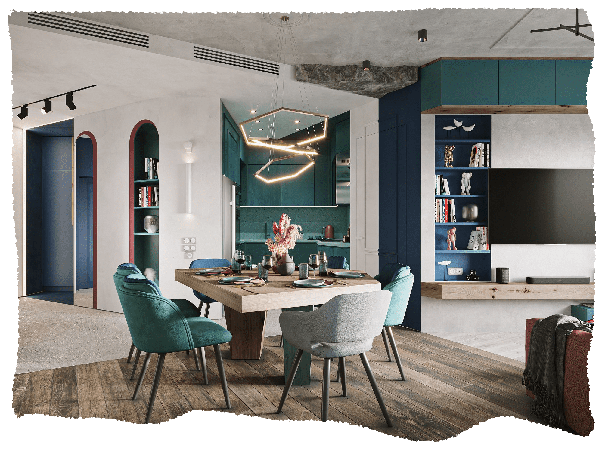 Наш Заказчик любит путешествовать и собирать не только впечатления, но и различные уникальные авторские предметы из поездок. Одним из его пожеланий было разместить открытые полки, чтобы выставлять на них свои коллекции. Отсюда и пошло название проекта.