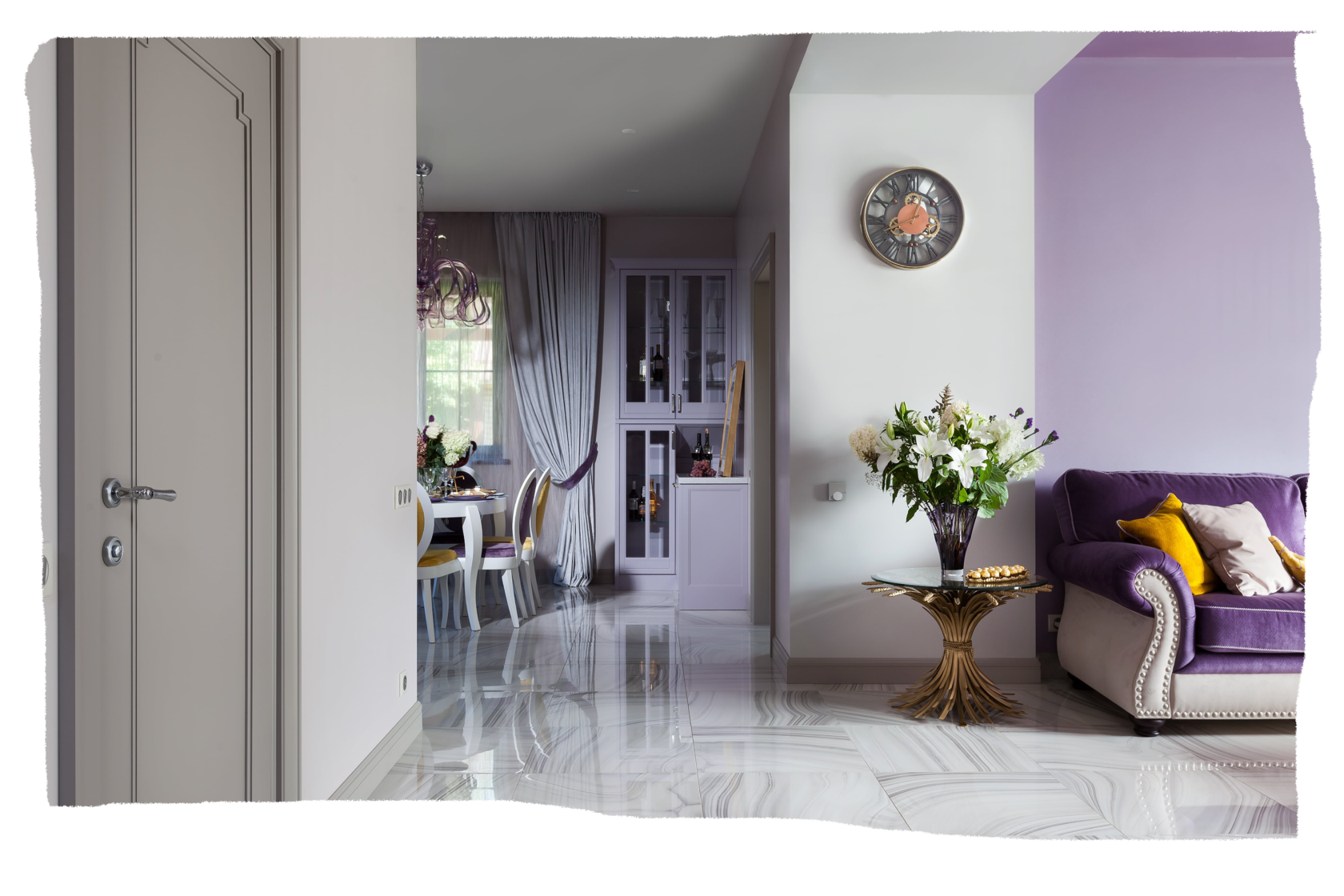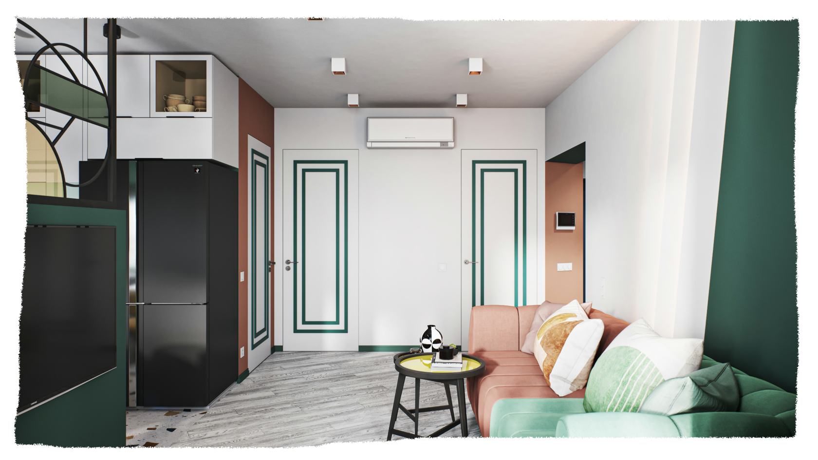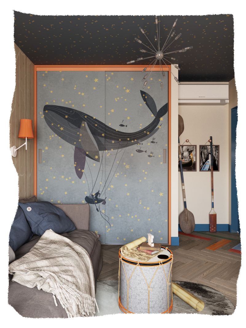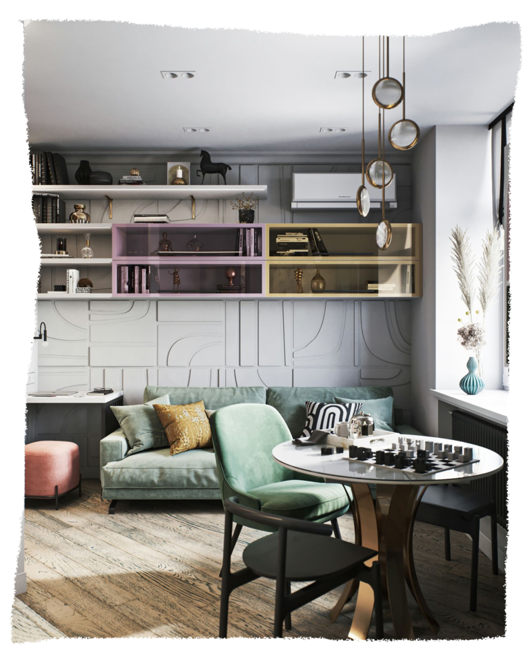 Дизайн квартиры разрабатывался для молодой семьи из трех человек–муж, жена и дочка, которая только что пошла в школу. Изначальную планировку помещения практически невозможно было изменить из-за несущих стен. И мы применили свой авторский прием–изменили границы при помощи цветовых объёмов, тем самым визуально расширили границы комнат.